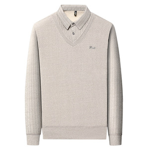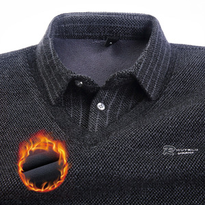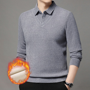 爆款加绒加厚冬季中年男士T桖假两件保暖上衣翻领条纹长袖男装