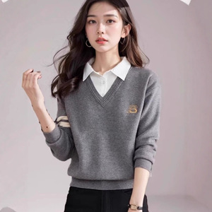 洋气假两件套上衣女秋冬款2025新款衬衫领针织打底衫休闲外穿毛衣