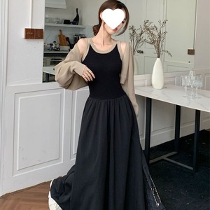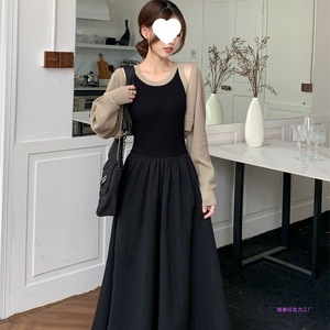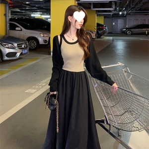初秋纯欲风大码两件套针织撞色背心连衣裙长袖披肩开衫胖MM套装女