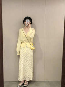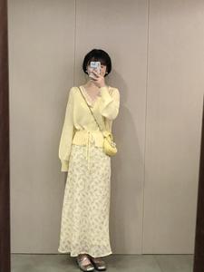 法式甜美黄色U领长袖开衫上衣女收腰显瘦针织衫外套初秋穿搭上衣