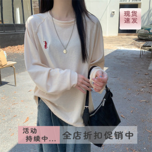 现货女装实拍秋季新款刺绣插肩袖宽松长袖t恤女韩系慵懒风上衣X