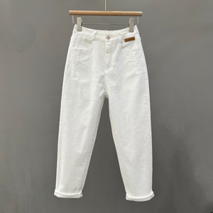 厂家直销批发米白色春秋休闲牛仔裤女百搭松紧腰高腰宽松显瘦哈伦