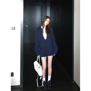 Skk Store 自在起居 松弛感羊毛大V领坑条针织衫短裤休闲套装女秋