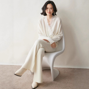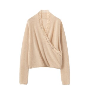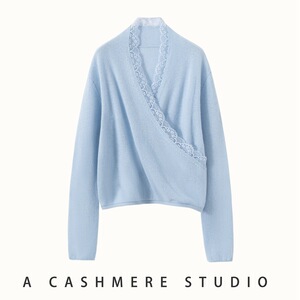 法式蕾丝花边交叉V领山羊绒衫女式针织上衣毛衣欧货宽松气质显瘦