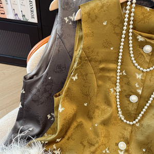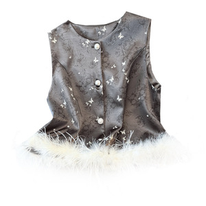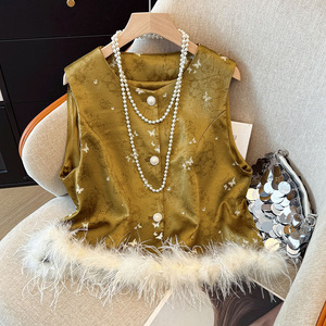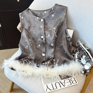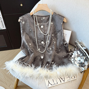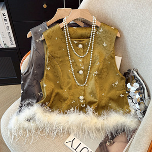 新款新中式国风马甲鸵鸟毛外套提花刺绣坎肩背心立领马夹女秋