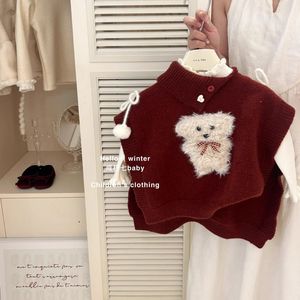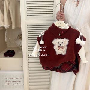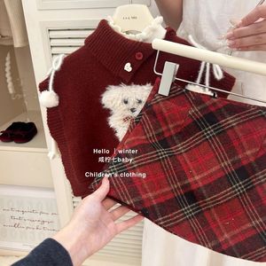韩版女童2025秋冬新款可爱红色斜开领小狗马甲斗篷女孩红格纹半裙