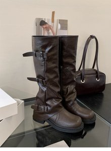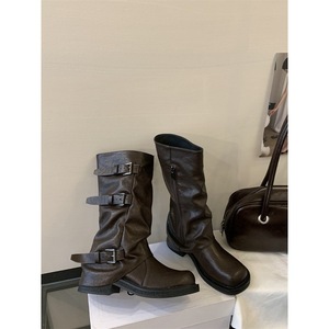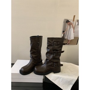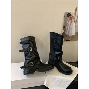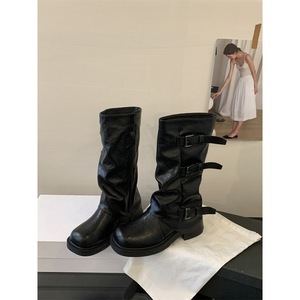 皮带扣厚底裤管靴女秋冬小众设计烟筒靴褶皱中筒堆堆靴粗跟高筒靴