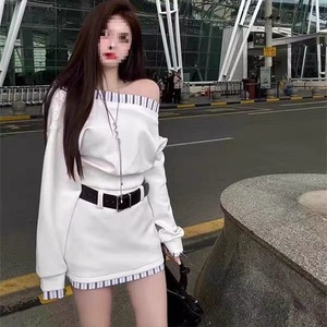 春季新款套装时尚设计拼接一字肩长袖上衣高腰半身裙