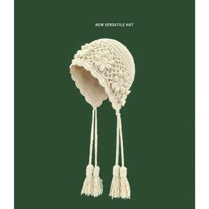 批发25新款手工编织花朵双层辫子毛线帽女秋冬保暖百搭针织护耳帽