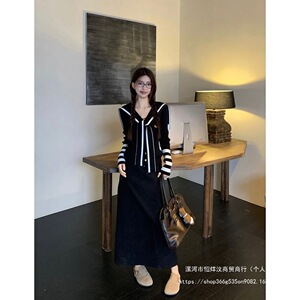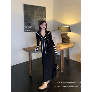 学院风海军领披肩长袖针织衫女秋季新款高腰显瘦半身长裙时尚套装