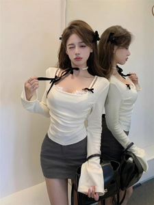纯欲辣妹显身材上衣女秋冬假两件长袖t恤喇叭袖蕾丝边打底衫内搭