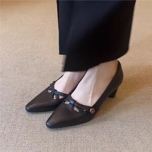 牛皮版~复古黑色山茶花粗跟单鞋女气质百搭浅口通勤尖头高跟鞋女