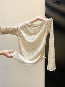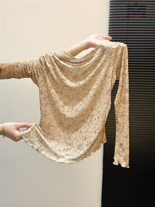 中古风老钱碎花别致印花长袖网纱罩衫秋季斜肩不规则下摆薄款上衣