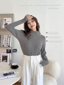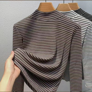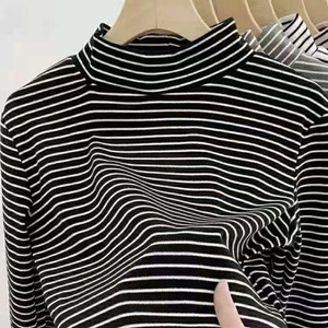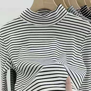 秋冬新款长袖洋气条纹半高领打底衫内搭修身简约时尚条纹长袖上衣