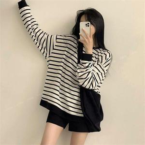条纹卫衣女设计感圆领学生韩版秋秋冬季薄款宽松bf慵懒风加绒大码