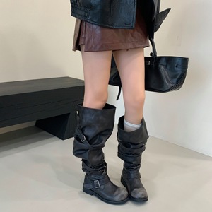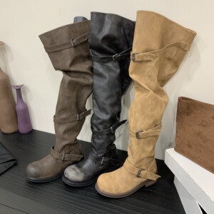 2025新款皮带扣堆堆靴过膝粗跟复古做旧长筒靴韩版靴小众工装靴女