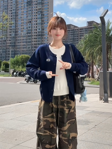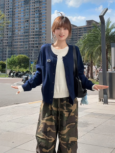韩系撞色拼接假两件针织开衫女早秋宽松休闲百搭短款长袖毛衣外套