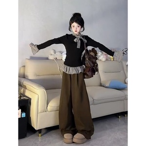 2025秋季新款假两件格纹拼接黑色洋气内搭修身长袖T恤打底衫女ins