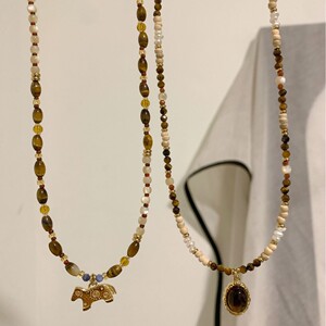 原创 美拉德棕色天然黄虎石虎眼石珍珠串珠锁骨链项链财运