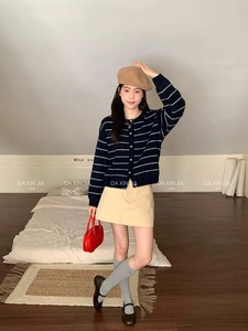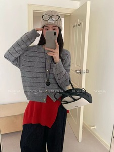 秋季新款百搭温柔风织衫打底针条纹毛衣外套外穿韩版圆领长袖女潮