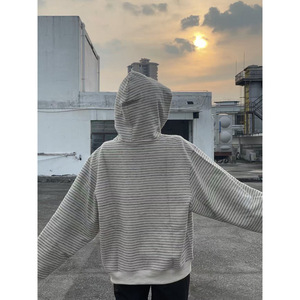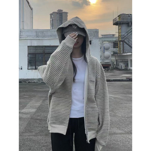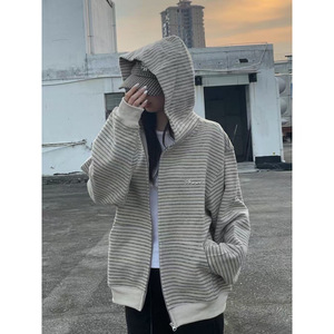 美式条纹重磅连帽卫衣外套男潮牌秋季宽松复古慵懒风拉链夹克开衫