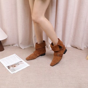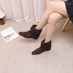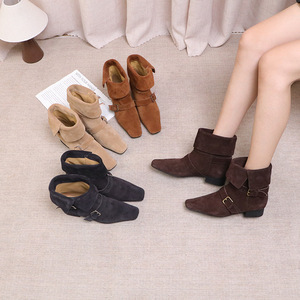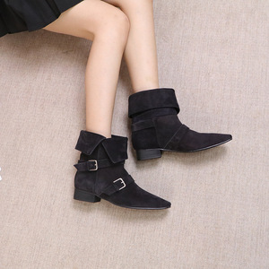 2025年新款尖头搭扣低跟软底时尚百搭反绒真皮休闲百搭女靴英伦风