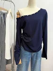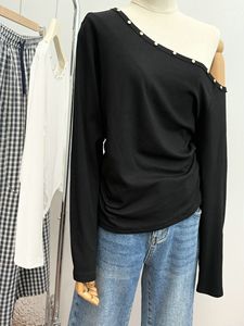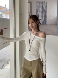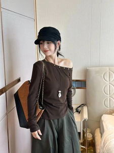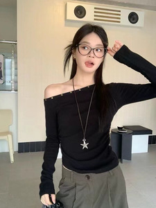 欧洲站2025年秋季新款正品时尚潮流柳钉斜肩设计感修身长袖T恤女
