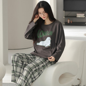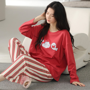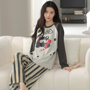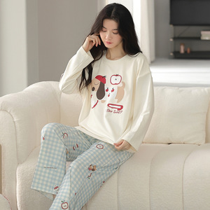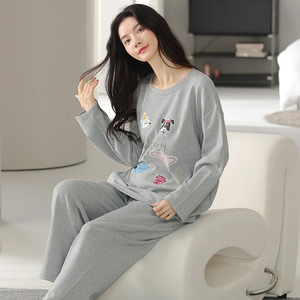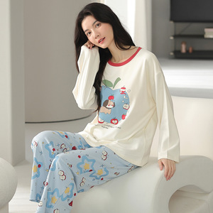 纯棉睡衣女春秋款带胸垫长袖套装2025新款圆领可爱卡通外穿家居服