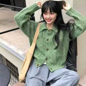 巨好看设计感韩里韩气翻领减龄绿色毛衣上衣女款2025新款秋装外套