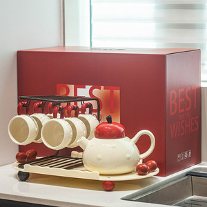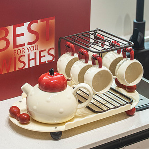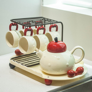 奶油色苹果水具(1壶6杯1咖色U形杯架1奶油色托盘)礼盒装