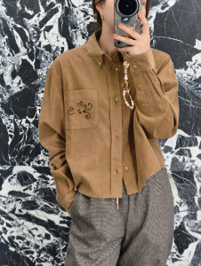 2025早秋新款Ce南油工厂复古美拉德学院风随性口袋刺绣长袖衬衫