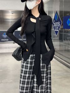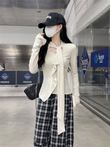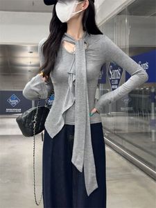 灰色镂空绑带长袖t恤女早秋季修身紧身短款不规则内搭打底衫上衣