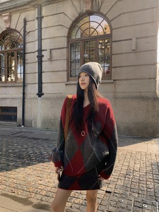 软糯洋气撞色菱格针织衫套装秋冬慵懒舒适毛衣两件套松弛感一整套