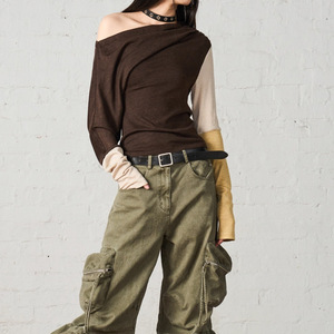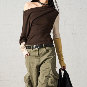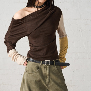Take当心 不对称斜肩抽褶堆叠长袖修身针织衫2025秋新休闲上衣