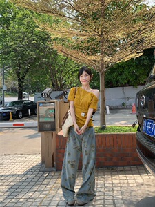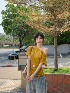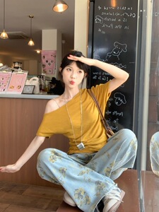 小众复古慵懒风设计斜肩T恤女2025夏季新款修身减龄百搭短袖上衣