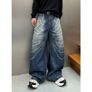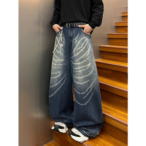 嘉衣库男装2025美式高街RO风个性水洗烫钻牛仔裤痞帅弯刀裤阔腿裤