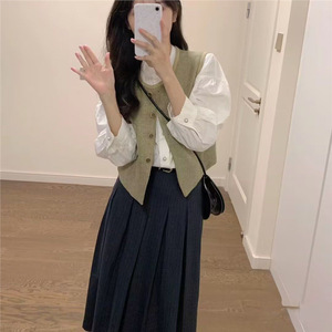 2025早秋新款温柔风气质设计感马甲背心叠穿长袖衬衫半身裙三件套