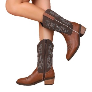 外贸大码刺绣英伦风中跟骑士靴2025秋季新款复古粗跟尖头外贸牛仔