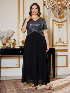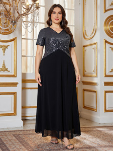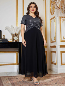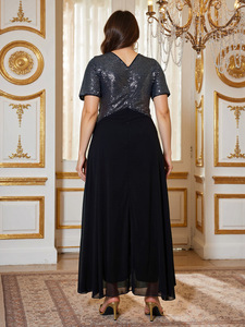 亚马逊独立站新款婚礼伴娘欧美大码女装双V领亮片拼接雪纺连衣裙