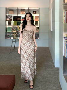SYT自制 垂感好网纱弹力显瘦格子吊带连衣裙