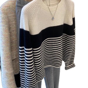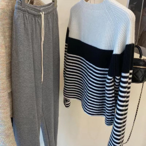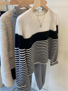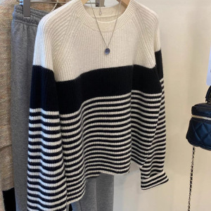 黑白条纹撞色圆领毛衣女2025秋冬新款高级感软糯慵懒风针织衫上衣