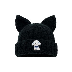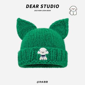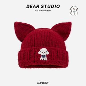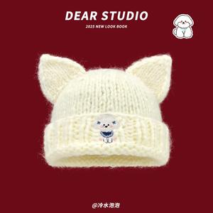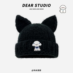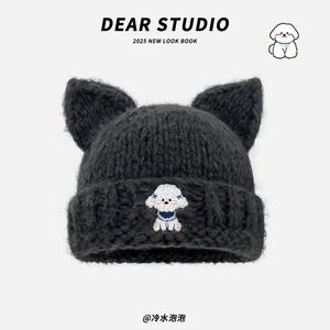日系可爱小狗刺绣猫耳针织帽子女2025新款秋冬保暖百搭护耳毛线帽