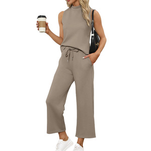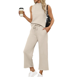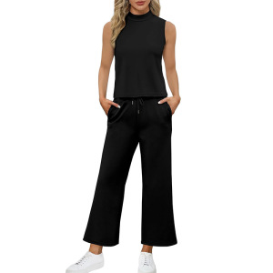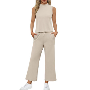 跨境欧美简约休闲套装直筒裤套装2件套无袖短款上衣女士家居服