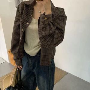 十三行品质货!2025秋季新款韩系复古宽松显瘦短款格子长袖衬衫女