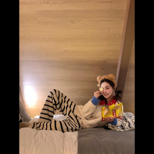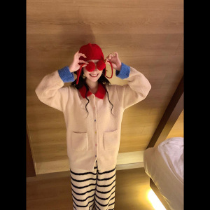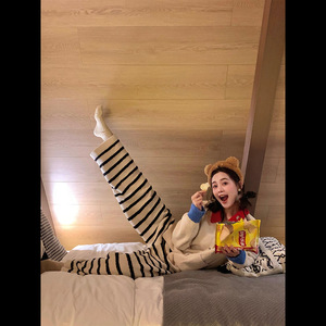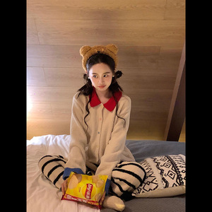 韩版少女撞色半边绒睡衣女冬季2024加厚保暖条纹长裤家居服两件套
