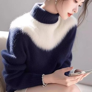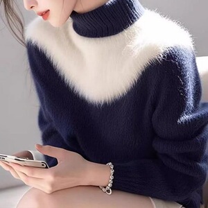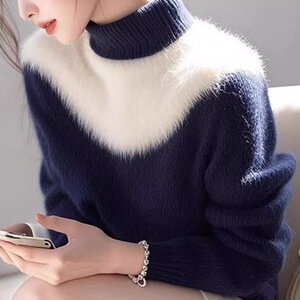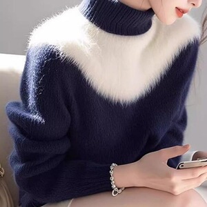 设计感蓝白撞色半高领毛衣女士2025年秋冬季新款软糯小众针织上衣