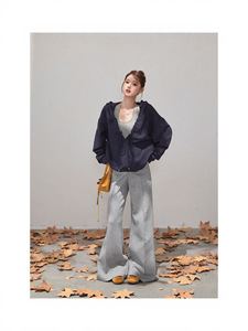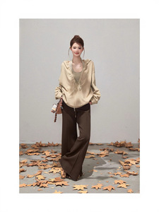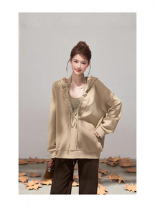 褶皱花边抽绳连帽V领长袖卫衣女秋季韩系休闲上衣慵懒风百搭美式