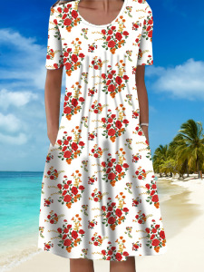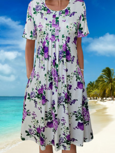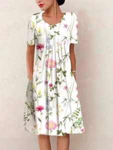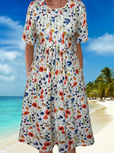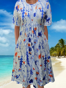 2025跨境亚马逊女装春夏度假休闲气质优雅花卉印花圆领口袋连衣裙