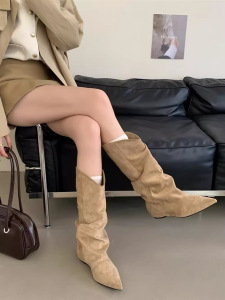 内增高绒面褶皱堆堆靴女2025秋冬新款尖头西部牛仔靴中筒靴瘦瘦靴