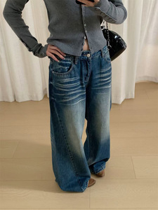 誉一新款2025秋季美式猫须抓纹阔腿牛仔裤女宽松复古长裤女hc1355